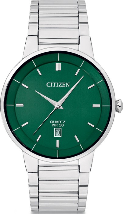 This sophisticated quartz timepiece exemplifies elegance through its refined simplicity and exceptional functionality. Designed with precision, it features sleek hands and markers, a modern stainless-steel case and bracelet, and a warm green dial. With a water resistance of up to 50 meters, this watch seamlessly combines style and durability, making it a perfect accessory for any occasion.