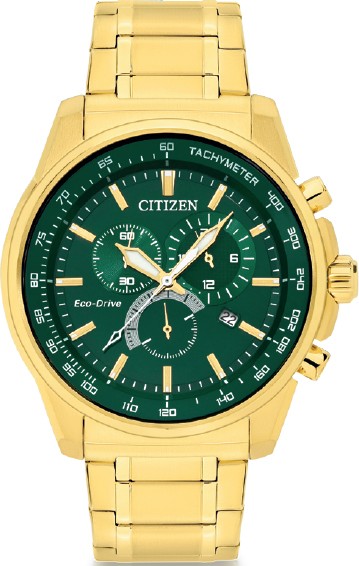 With a design that seamlessly blends classic and modern elements, this Eco-Drive powered watch exudes refined simplicity. The gold tone stainless steel case and bracelet perfectly complement the striking green dial with a date display, creating a versatile look that pairs effortlessly with any wardrobe. Powered by Eco-Drive technology, it eliminates the need for battery replacements. With WR100/10bar water resistance and a secure push-button buckle, it