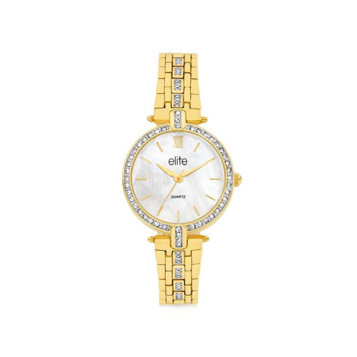 Introducing Voila - a watch that effortlessly captures the art of elegance. This gold beauty features a luminous mother-of-pearl dial that shimmers with every glance, perfectly complemented by refined crystal hour markers and a sparkling crystal-set bezel. The multi-link gold bracelet adds sophistication and a hint of vintage charm, while the slim case and minimalist detailing keep the design refreshingly modern. Whether you're dressing for an occasion or enhancing your everyday ensemble, Voila is the finishing touch that says it all with poise, polish, and grace.