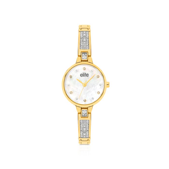 Graceful and refined, the Vita watch by Elite is a celebration of understated luxury. Its slim gold-tone bracelet is delicately adorned with crystals, adding a soft shimmer with every movement. The luminous mother-of-pearl dial features minimalist crystal hour markers, creating a sophisticated contrast that feels both modern and timeless. Crafted for the woman who appreciates subtle glamour, Vita is the perfect accessory for elevating everyday wear or completing an evening look.