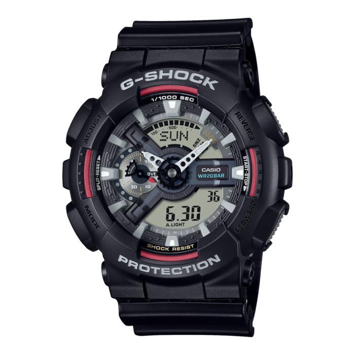 A stand-out with distinctive large case. The original colour scheme is faithfully reproduced with touches of G-SHOCK red, representing the passion to take on challenges; blue, symbolizing excellent water resistance; and yellow, signifying outstanding shock resistance.