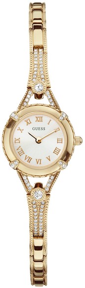A modern take on vintage jewellery styling by GUESS. A petite 22mm case is paired with a delicately finished self-adjustable gold-tone stainless steel bracelet, which features a touch of glitz to elevate your aesthetic.