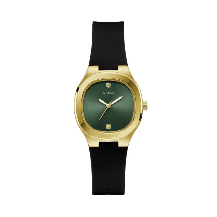 Exuding modern, sporty style with this sleek new timepiece from GUESS Watches, featuring a new rounded square case with a genuine diamond marker at the 12 o'clock hour. The minimalistic 32mm gold tone case showcases a gorgeous green dial and smooth black silicone strap for ultimate comfort.