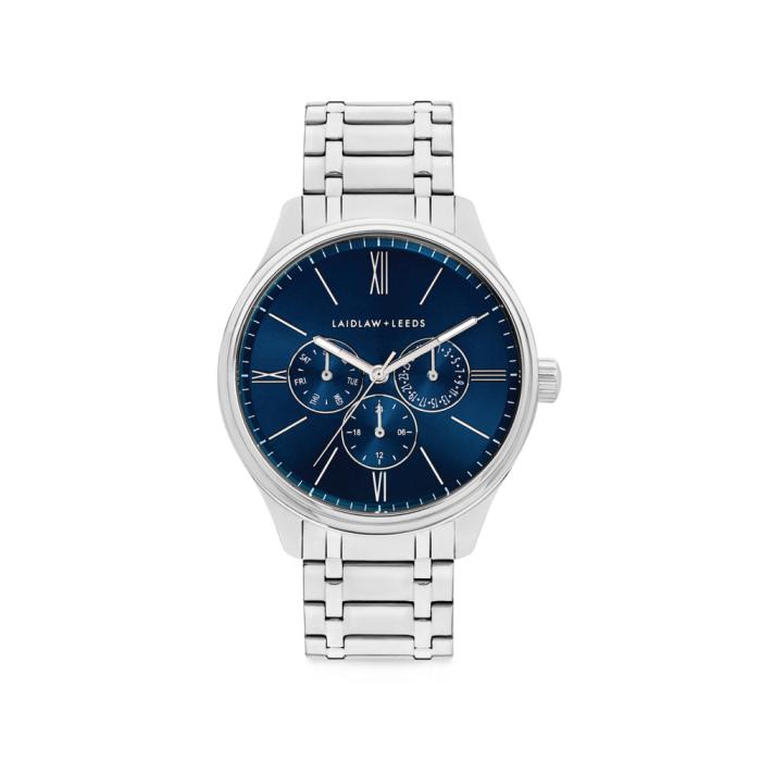 Always be on time with this stylish and sleek Laidlaw + Leeds multifunction watch. This timeless masterpiece adds a touch of sophistication to your attire, featuring a silver tone stainless steel case and strap and a stunning blue sunray dial.