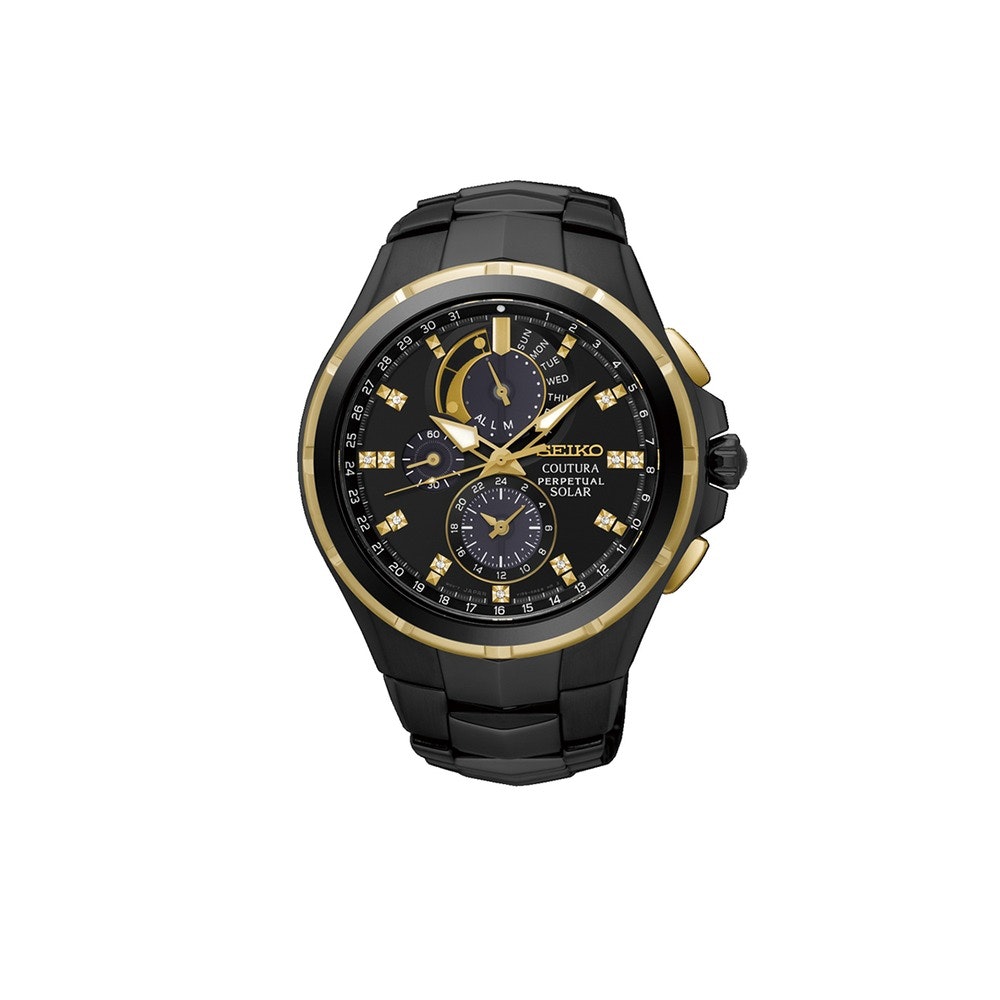Seiko Coutura Men's Black and Gold Tone, Solar Powered, Chronograph, 11 Diamonds set Dial, Perpetual Calendar, Sapphire Glass, 100m Water Resistant Watch