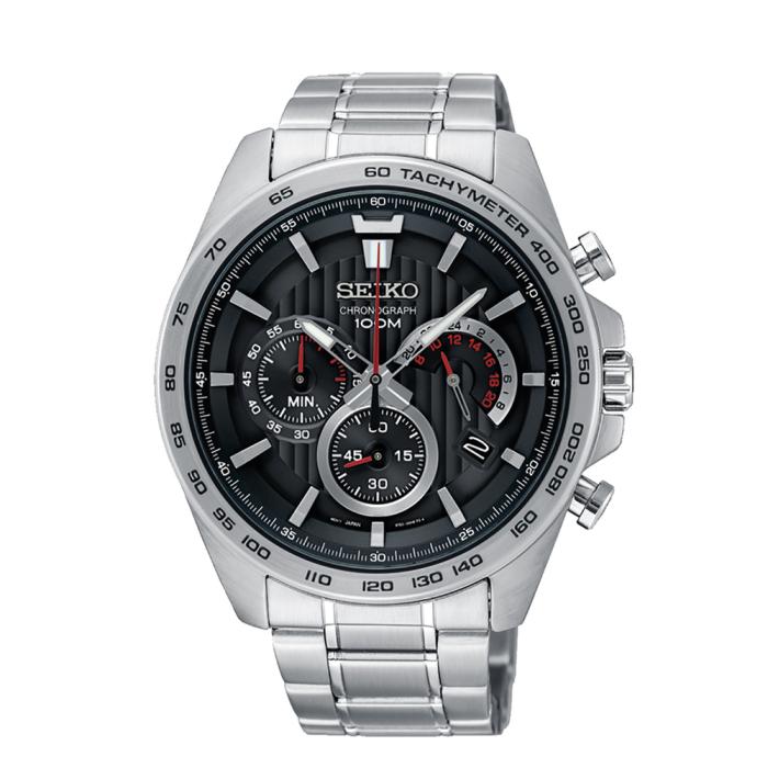 Seiko men's chronograph, silver tone tone, black dial, bracelet band & 100m water resistant watch