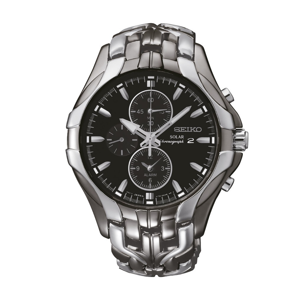 Seiko Mens Alarm Chronograph 100M w resist date calendar combined SS and hard coating silver and blk case silver and blk bracelet blk dial and subdial baton luminous markers