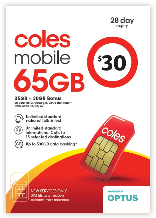 $30 SIM offer: Pay $11 for the $30 SIM by 25/11/26 and activate onto the $30 plan by 01/04/26 to receive 65GB (35GB + 30GB bonus data) for your first three recharges made within 90 days of activation (activation counts as first renewal). Reverts to standard data after that. T&Cs apply. New services only.