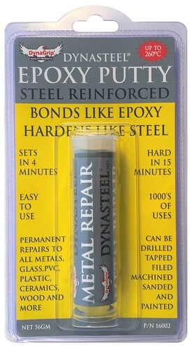 Steel reinforced epoxy putty. Mixes like putty, bonds like epoxy, hardens like steel.