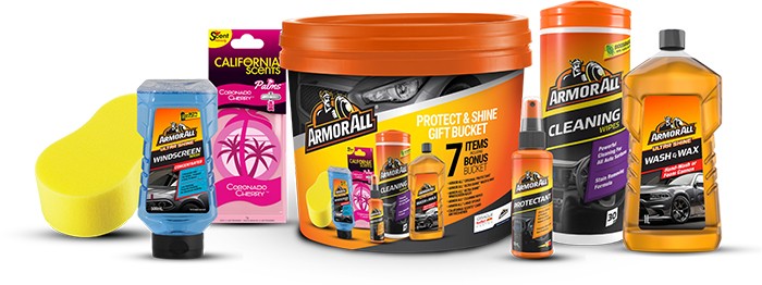 7 items including bonus bucket, Original Protectant 125ml, Ultra Shine Wash & Wax 1L, Ultra Shine Windscreen Wash 500ml, Cleaning Wipes 30pk, Large Sponge, California Scents Carded Air Freshener.
