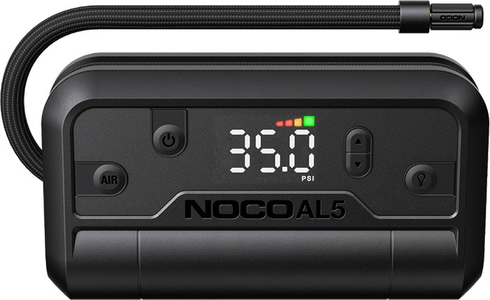 12-volt, 5-amp portable air compressor with a 90-Watt motor rated at a maximum pressure of 130 PSI.