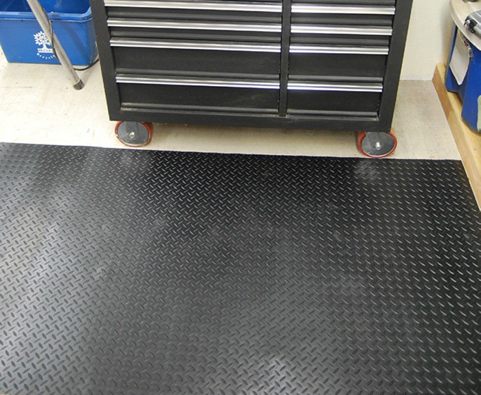 Heavy duty rubber. Non-slip. Diamond plate texture. Protects floors from spills, dropped tools & other breakables.