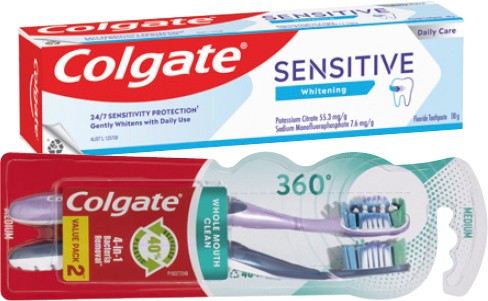 Colgate Sensitive Toothpaste 110g, 360° Toothbrush 2 Pack or Total Mint Waxed Dental Floss 100m** Selected Varieties