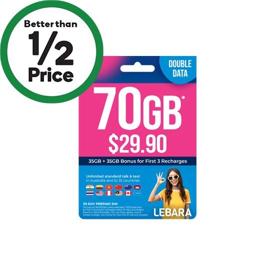 §For use in AU. 35GB + 35GB for first 3 consecutive recharges, reverts to 35GB thereafter. Activate by 16/3/26 (unless extended). New customers only. Up to 200GB of unused data can be rolled over to next month when recharged with an eligible plan before expiry. Visit lebara.com.au/mobile-plan/medium-sim/ for full list of countries included in your plan. T&C apply.