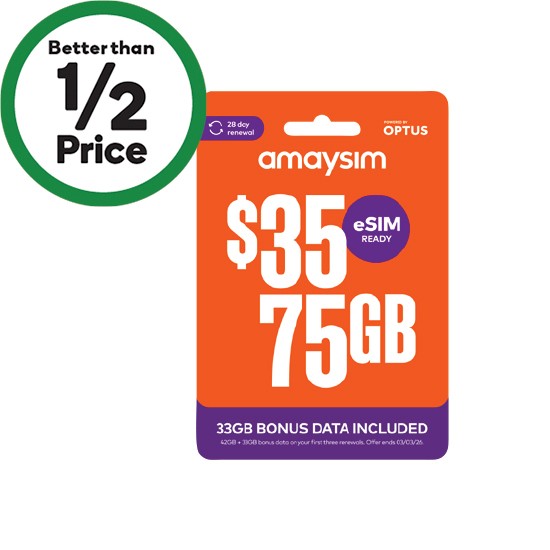 †Terms and Fair Go policy apply. New services with 4G/5G compatible devices only. For use in Aus. Limit of 3 per customer. Promo price valid for first renewal till 9/12/25. Activate by 3/3/26 to get bonus data for first 3 renewals when you renew on or before your renewal date. Bonus data not available with any other offer and not exchangeable or redeemable for cash. Ongoing is $35/42GB/28 days. Auto renews every 28 days. Inclusions when you choose $35 UNLIMITED plan. See amaysim.com.au/35 for details. Download speed caps apply. 5G available in selected areas (excl NT) with a compatible device. eSIM requires an eSIM compatible device. See amaysim.com.au/about/coverage. See amaysim.com.au/terms.