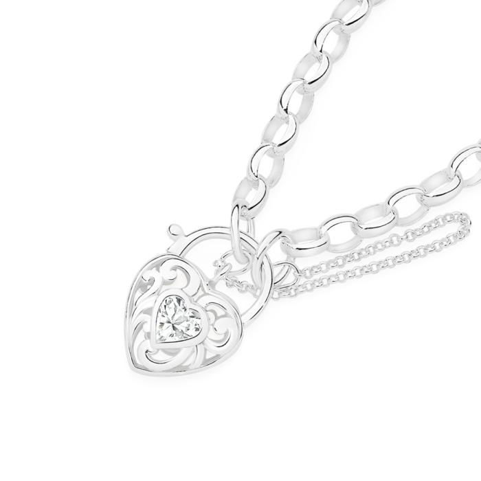 Sterling Silver Cubic Zirconia 18.5cm Heart Scroll Padlock Bracelet
