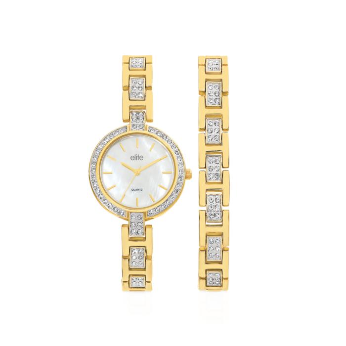 Radiant and refined, the Lia Set embodies timeless elegance with a modern twist. This luxurious duo includes a matching watch and bracelet, both designed in gleaming gold tones and adorned with sparkling crystal accents. The mother-of-pearl dial is framed by a crystal-set bezel, offering a luminous finish that captures the light beautifully from every angle. Perfect for special occasions or adding a touch of glamour to everyday wear, the Lia Set is a celebration of sophistication and style, effortlessly graceful and endlessly versatile.