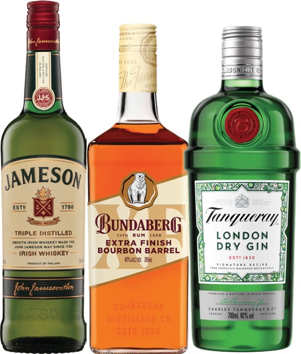 Jameson Irish Whiskey, Bundaberg Extra Finish Bourbon Barrel Rum or Tanqueray Gin 700mL