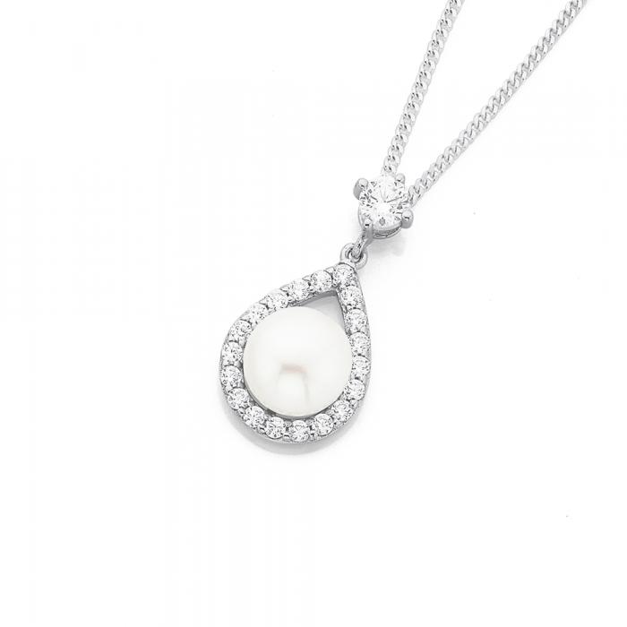 Sterling Silver Cultured Freshwater Pearl & CZ Pear Drop Pendant.