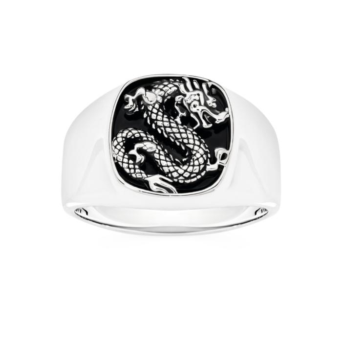 Sterling Silver Black Agate Dragon Signet Ring. Available in Size U, W & Y.