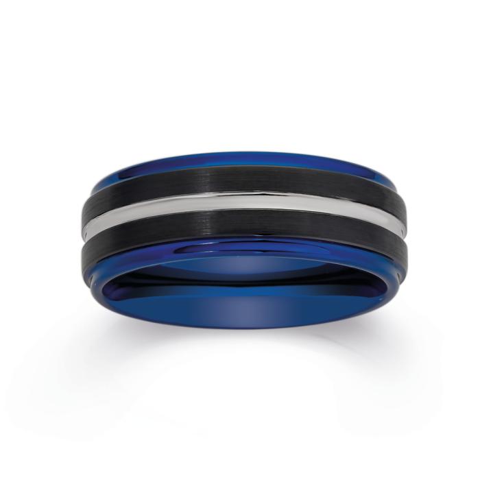 Tungsten Carbide Black with Blue Bevel Edges and Silver Line Ring in Size W. Approximate Dimensions: 8mm Width. 'Tungsten' is derived from a Swedish phrase meaning 'heavy stone' in honour of its weight and strength. On its own tungsten is brittle but when chemically bonded with other elements it becomes 'Tungsten Carbide' which is then a metal alloy with superior strength, hardness, and durability. It rates 9 on the 'Mohs' scale of mineral hardness (with 10 being the hardest), it is 3 times harder than titanium and cobalt chrome. All designs are 'comfort fit' with no sharp edges. They will not rust or tarnish, maintaining the polished finish for many years to come. Can be ordered in sizes S to Z+2 instore only.