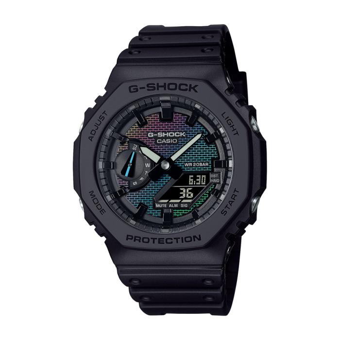 G-Shock men's analogue/digital, world time, stopwatch, alarm, black resin with rainbow dial & 200m water resistant watch Another brick in the wall this one in a full rainbow of colour. Introducing bold designs with watch glass or dial featuring the original brick wall pattern of the very first G-SHOCK in full-on colour. Rainbow vapor deposition reproduces the symbolic brick wall imagery in brilliant rainbow hues that shift and change depending on the light. The colourful design stays true to the origin of G-SHOCK with the spirit of toughness it takes to overcome barriers and constantly push limits.