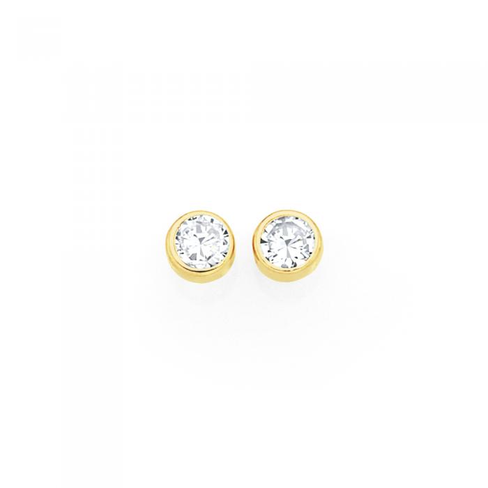 European Made 9ct Gold Round Cubic Zirconia Bezel-set Stud Earrings - 3mm CZ Diameter