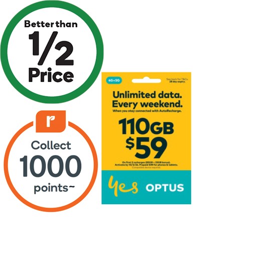 §Optus $39 SIM & Optus X Plus offers end 6/1/26. Optus $59 SIM & Optus X-Pro 2 5G offers end 30/12/25. Savings off prior price for these products in Woolworths. Activate within 30 days of purchase or by date advertised on the promotion, whichever is earlier. Free Prepaid SIM: New services only. Activate SIM to apply included recharge to an available plan of same value. See optus.com.au/prepaidplans for full plan details. $39 SIM Starter Kit: Includes $39 recharge. New services only. Data for first 3 recharges within 90 days of activation, then reverts to 25GB (or as otherwise notified). $59 SIM Starter Kit: Includes $59 recharge. New services only. Data for first 3 recharges within 90 days of activation, then reverts to 45GB (or as otherwise notified). Unlimited Data Weekends: from 12.01am Sat to 11.59pm Sun (local time) when you activate/recharge with AutoRecharge on $39/$59 Optus Flex Plus (excl. expired and manual recharges). Not accessible on modems. Data rollover: recharge before expiry. Network: Provides access to Optus 4G Network and Optus Standard 5G (non-standalone) Network only. 5G avail. in select areas with a compatible device and plan. Coverage varies, see optus.com.au/coverage. For SIM offers, ongoing recharges revert to standard price. Device must be compatible with the Optus Network, see optus.com.au/compatibility. All for use in AUS. Fair Go Policy applies. While stocks last. Products may not be available in all stores. Please see woolworths.com.au for "device" stock availability at a store near you. SIM Starter Pack availability is unavailable online and needs to be checked in-store.