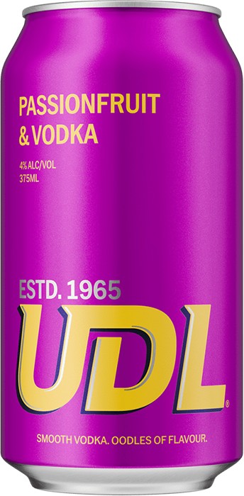 The original UDL Vodka and Passionfruit takes on a new look. Inspired by retro vibes of the '80's and 90's this pack is sure to turn heads and help you start the party. The sweet and vibrant flavour of passionfruit is blended with soda and Vodka in this refreshing premixed drink.