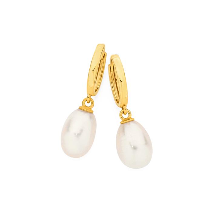 9ct gold huggie earrings with10mm freshwater teardrop pearls. Approximate Dimensions: 30mm Hoop Inner Diameter, Height 25mm including pearl