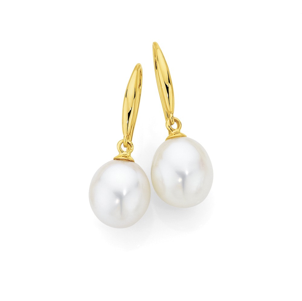 9ct Gold Cultured Fresh Water Pearl Shepherd Hook Drop Earrings Pearl Size = 9mm, Approximate Length (including hook) = 25mm