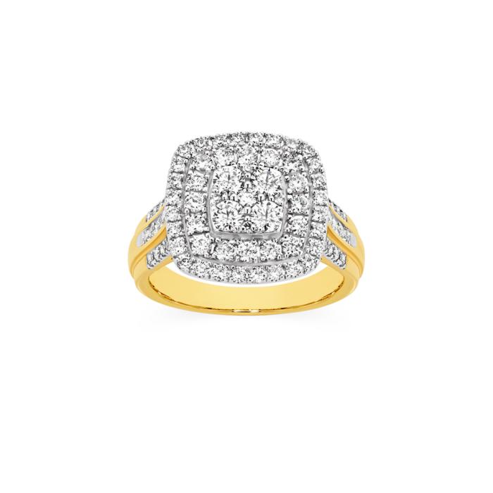 Alora 10ct Gold Lab Grown Diamond Cushion Shape Cluster Three Row Shoulder Set Ring Total Weight = 1.50ct