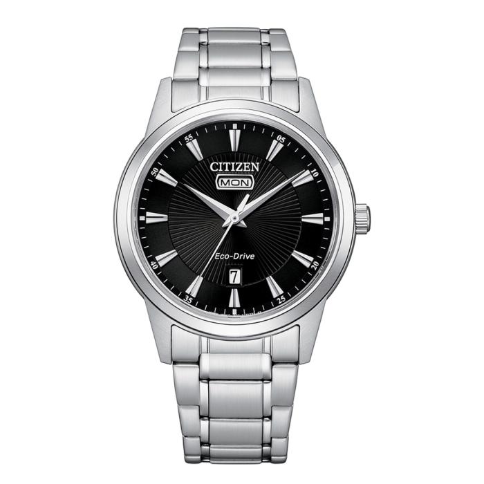 A modern timepiece that displays classic aesthetic appeal. The looks of this watch are equally matched by its reliability. A smooth black sleek dial and stainless steel bracelet. Features include Day/ Date, and low charge indicator. Powered by our Eco drive, never needs a battery, only a light source.