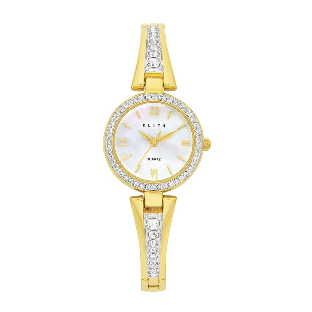 Radiate brilliance with the Ella watch a dazzling blend of classic femininity and refined glamour. Set in a polished gold-tone case, the timepiece features a graceful mother-of-pearl dial accented by elegant gold markers, bringing a luminous finish to your wrist. The bezel and slimline bracelet are adorned with rows of shimmering crystals, adding a touch of sparkle to every gesture. Its delicate silhouette makes it perfect for special occasions, while its timeless elegance ensures it elevates even your everyday attire. Elle is not just a watch it's a statement of grace, luxury, and confidence.