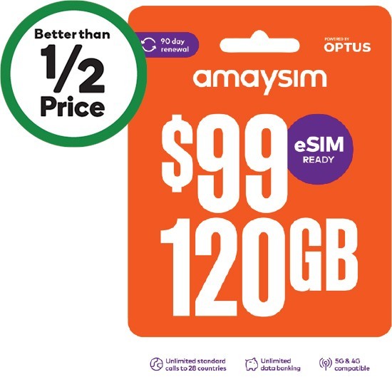 §Terms and Fair Go policy apply. New services with 4G/5G compatible devices only. For use in Australia. Limit 3 per customer. Download speed caps apply. 5G available in selected areas (excl NT) with a compatible device. eSIM requires an eSIM compatible device. See amaysim.com.au/about/coverage. See amaysim.com.au/terms. Promo prices valid for first renewal only for amaysim $25, $35, $99 and $270 Starter packs purchased between 7/1/26 to 3/2/26. Activate the $35 Starter pack by 3/3/26 to get bonus data for first 3 renewals when you renew on or before your renewal date, or $270 Starter pack by 3/3/26 to get bonus data for first renewal. Bonus data not available with any other offer and not exchangeable or redeemable for cash. Ongoing is $25/28 days/15GB, $35/28 days/42GB, $99/90 days/120GB, $270/365 days/200GB. $25 and $35 Starter packs auto-renew every 28 days. $99 Starter packs auto-renew every 90 days. $270 Starter packs auto-renew every 365 days. Inclusions when you choose $25 UNLIMITED plan, $35 UNLIMITED plan, $99 UNLIMITED plan or $270 UNLIMITED plan. See amaysim.com.au/25, amaysim.com.au/35, amaysim.com.au/99 and amaysim.com.au/270 for details. While stocks last. Products may not be available in all stores. Please see woolworths.com.au for "device" stock availability at a store near you. SIM Starter Pack availability is unavailable online and needs to be checked in-store.