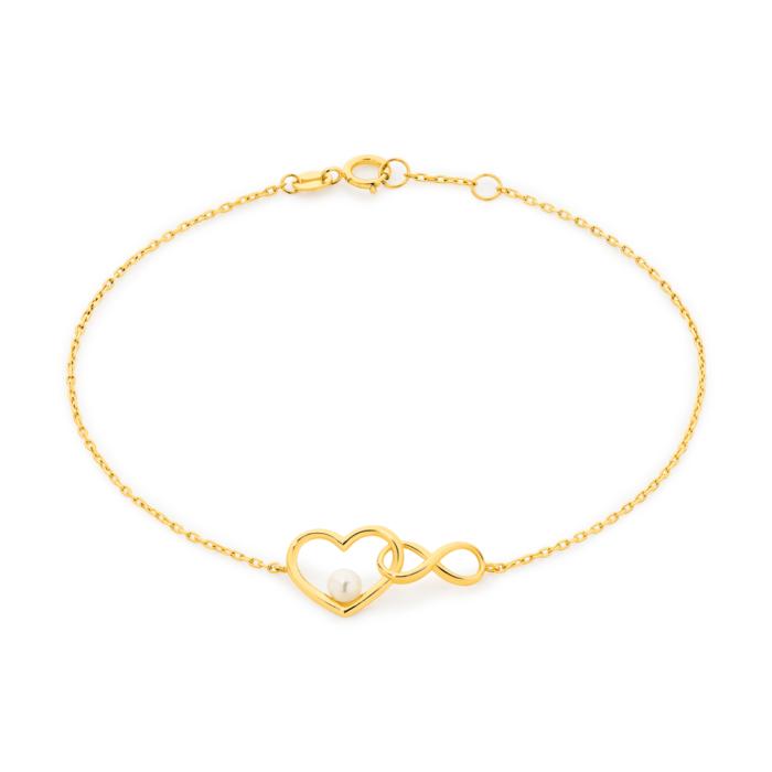 9ct gold 19cm interlocking heart and infinity trace bracelet with a cultured freshwater pearl