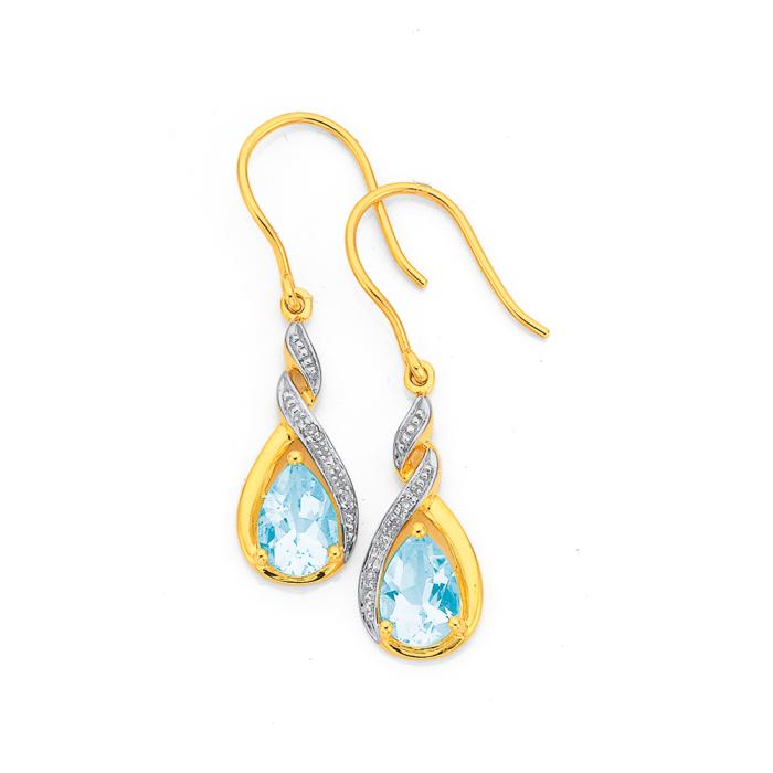 9ct Gold Aquamarine and Diamond Pear Cut Teardrop Twist Drop Earrings Aquamarine = 7 x 5mm. While we endeavour to display the most accurate gemstone colours on our website many factors can alter this accuracy at times, including the photographic process, the colour accuracy of your monitor, lighting and the fact natural stones are not all the same. Therefore the products delivered may not be perfectly identical to those displayed in the photograph or on your monitor. Approximate Earrings Height (with hook) = 28mm, Width = 8mm