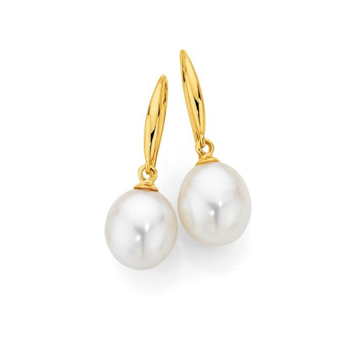 9ct Gold Cultured Fresh Water Pearl Shepherd Hook Drop Earrings Pearl Size = 9mm, Approximate Earrings Height (with hook) = 25mm