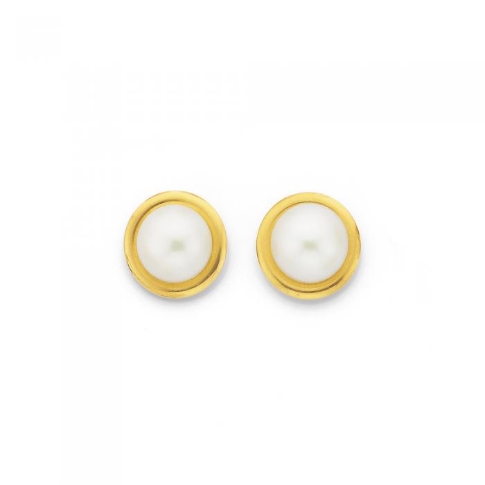 European Designed & Manufactured 9ct Gold Cultured Fresh Water Pearl Gold Rim Stud Earrings. Pearl size = 8mm