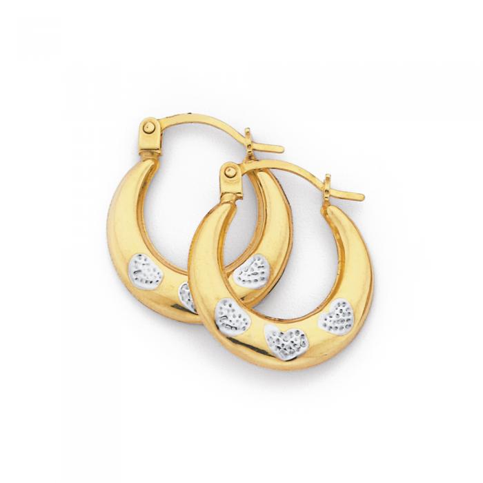 9ct Gold Two Tone Triple Hearts Creole Earrings.