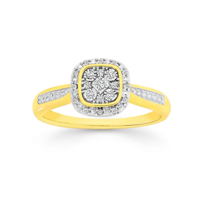 9ct Gold Diamond Round Brilliant Cut Miracle Set Cushion Shape Shoulder Set Ring Total Diamond Weight=.10ct