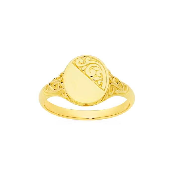 9ct Gold Filigree Engravable & Polished Oval Signet Ring. Available in Sizes O & Q.