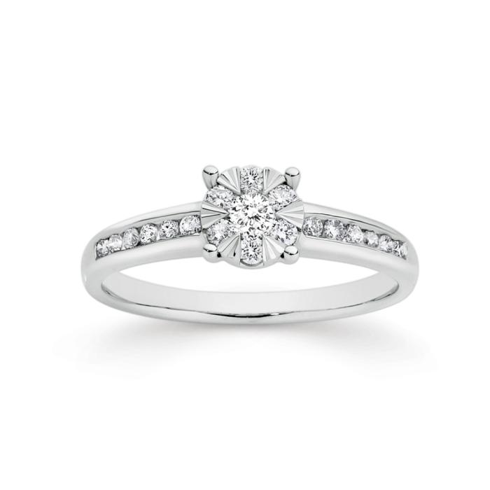 9ct White Gold Diamond Round Brilliant Cut Cluster Engagement Ring with Channel Set Shoulder Stones Total Diamond Weight=.35ct