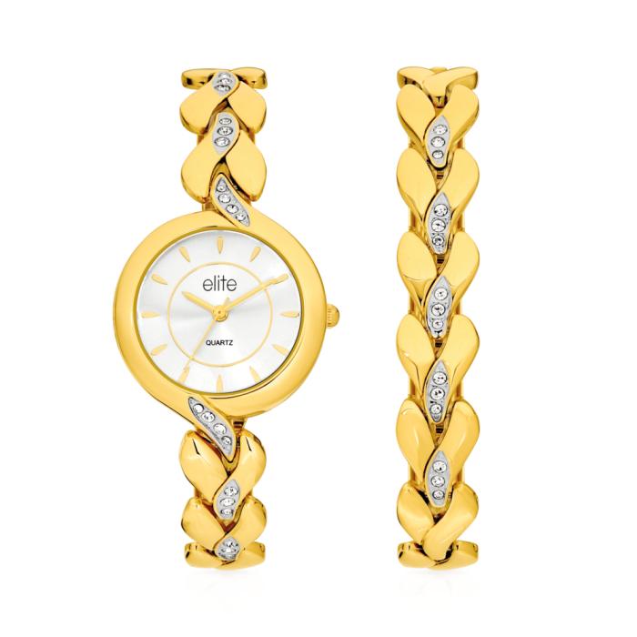 Graceful, elegant, and effortlessly timeless the Iris watch is designed to be as captivating as the woman who wears it. This exquisite timepiece features a lustrous gold-tone finish paired with a stunning leaf-inspired bracelet design, each link delicately accented with sparkling crystals for an added touch of luxury. The minimalist dial keeps the focus on refined elegance, while the matching bracelet completes the set, making it the perfect accessory for both everyday sophistication and special occasions.