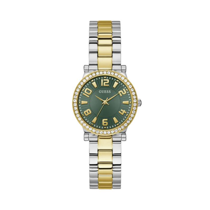 Chic and understated, this stunning 32mm silver and gold duo tone watch from GUESS features a striking green sunray dial enriched with crystals on the gold tone bezel and finished with a polished silver and gold duo tone bracelet for effortless style.