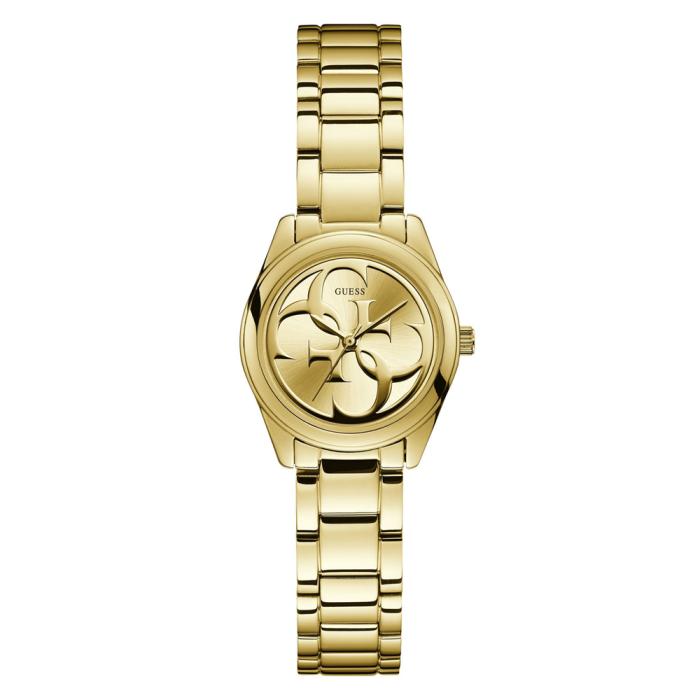 This new timepiece from GUESS features a 28mm sunray champagne logo dial and gold tone polished stainless steel strap, making it an easy transition from day into night.