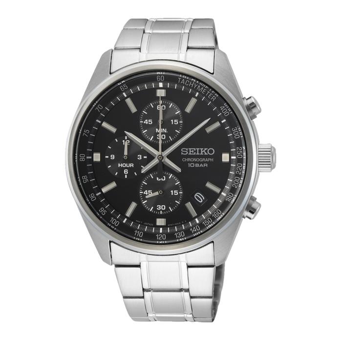 Seiko men's chronograph, silver tone, black dial, & 100m water resistant watch.