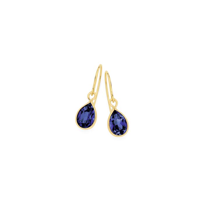 9ct Gold Bezel Set Hook Earrings with Pear Cut Created Sapphire. Created Sapphire stone size = 7x5mm