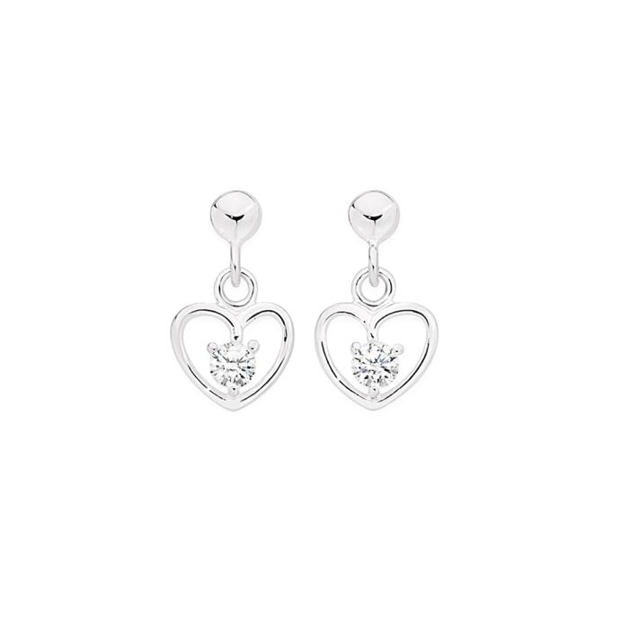 Sterling Silver Childs White Cubic Zirconia Heart Drop Earrings