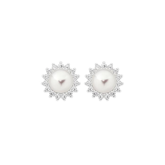 Sterling Silver 7mm Freshwater Pearl & CZ Flower Stud Earrings
